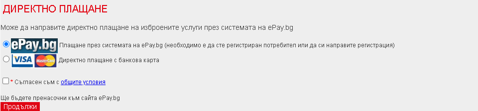 - За да платите задълженията чрез услугата Директно плащане е необходимо да изберете метода на плащане и да сте се запознали с Общите условия за директно плащане